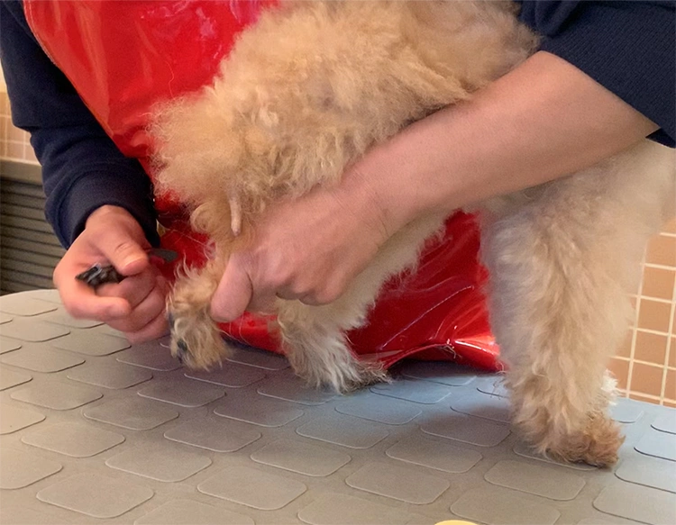 - 肉球や皮膚を傷つけないよう、刃を軽く当てて刈る。