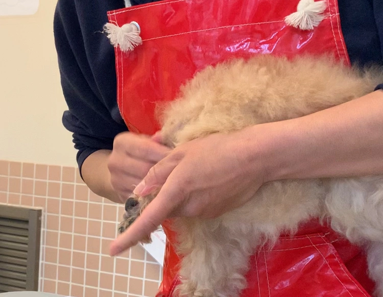 - 犬が動かないように優しく固定し、無理な力をかけない。